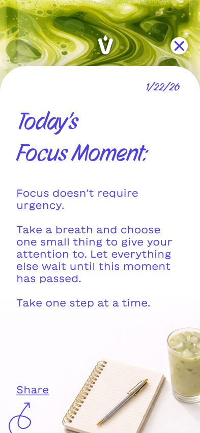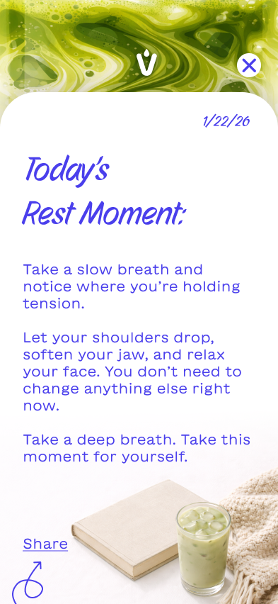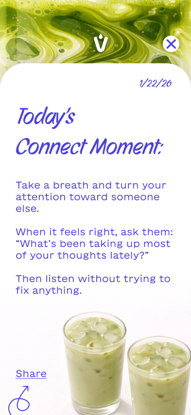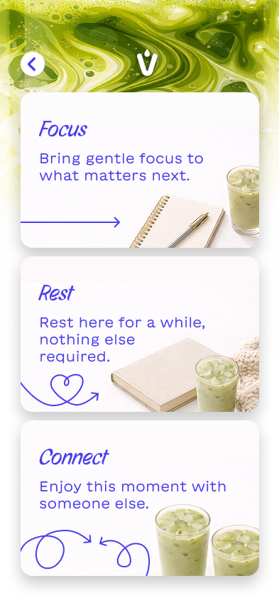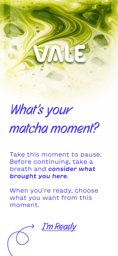 Instead of building a typical ordering or rewards app, I explored how Vale could create a digital experience that encourages people to return to the brand in a more meaningful way. Each package includes a QR code that launches an interactive mobile experience designed around the feeling someone wants in that moment—whether it’s focus, rest, or connection. The app becomes an extension of the ritual itself, offering guided prompts, ambient visuals, and small moments of interaction that complement the act of preparing and drinking matcha. By shifting the focus from transactions to experience, the concept reimagines how packaging, product, and digital design can work together to build a deeper relationship with the brand.